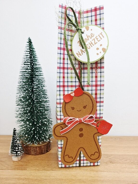 Es gibt noch einige Dinge, die verpackt werden wollen, dazu habe ich u.a. das schöne Produktpaket ‚Lebkuchenmann‘ benutzt. Hier auf einer Designerpapier-Box … In die große Tüte passt beispielsweise eine Tüte selbstgebackene Kekse oder auch ein selbstgemixtes Likörchen …