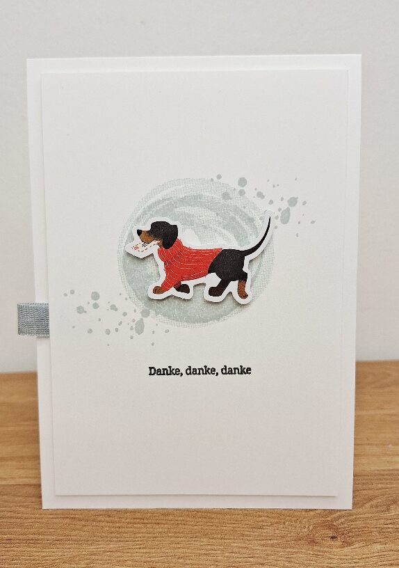 Bei dieser Karte habe ich die neuen Stempelsets SWIRLED DESIGNS und FÄHNCHEN-GRÜSSE verwendet. Der hübsche Vierbeiner ist aus dem Besonderen Designerpapier ZUSTELLUNG VOM NORDPOL.