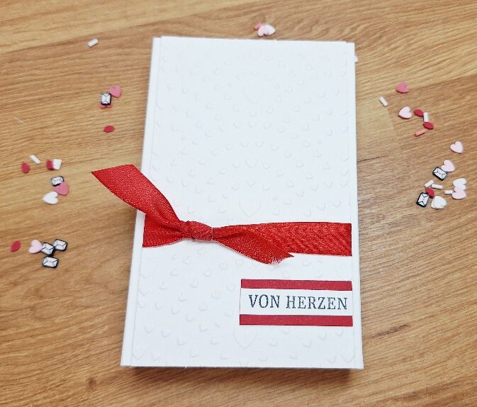 Hier habe ich noch für Valentinstag eine kleine Box vorbereitet. Der Aufleger wurde mit der neuen 3-Prägeform ‚Verliebte Herzen‘ geprägt und mit einem Band in Glutrot versehen. Der Gruß ‚von Herzen‘ ist ebenfalls aus dem Stempelset ‚Wunderbar gesagt‘.